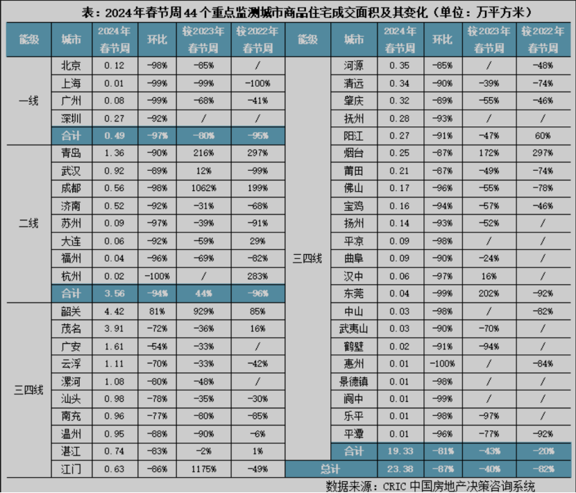 受房企推盤積極性較低影響,2024年春節(jié)樓市成交延續(xù)平淡行情。CRIC監(jiān)測數(shù)據(jù)顯示,44個重點城市在春節(jié)周成交量僅為23.38萬平方米,環(huán)比下降87%,同比下降40%,較2022年同期降幅也達到了82%。即便年前核心一二線相繼松綁限購、放松限貸,對于購房者的刺激作用依然有限。