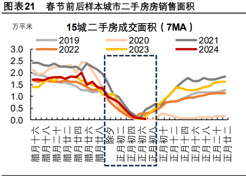 因為歷年春節(jié)期間的成交量、尤其是二手房成交量很低,從平安證券的圖里面能直觀的看出來。