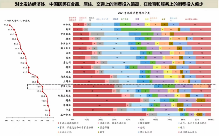 此前有機構(gòu)把中國人每年的消費支出,衣食住行,和其他國家作對比,對比發(fā)現(xiàn)我們在食品、居住上面的投入偏高,在旅游等服務(wù)上的投入偏低。